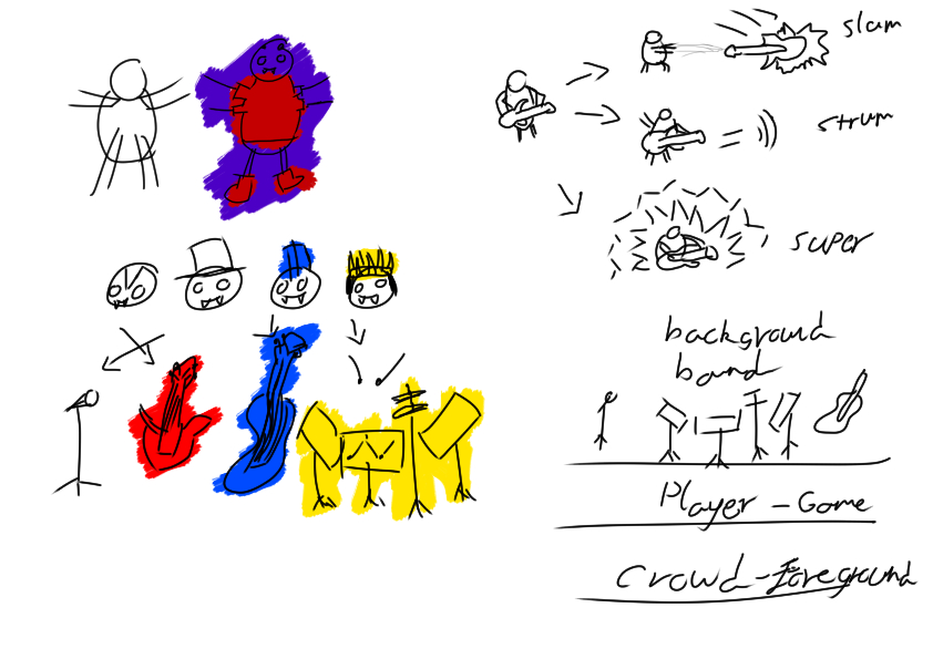 Style: Looks like a high school sketch inspired by old flash games such as fancy pants adventures (2006). This style will allow me to make my own assets faster without having to focus on consistency as character's animations will purposely look rough. I decided to be messy with the colouring of characters and colouring outside the lines as to make it look more like a drawing made by someone young and I think it complements the rock theme as it can be seen as being loud visually while doing something different from the colouring of the stage which will remain inside the outline.