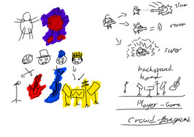 Combat: There are two primary attacks, soundwaves and slam. Sound Waves are used to drive away flying enemies and stun grounded ones, this attack is aimed with the mouse which will be shown in game as a crosshair and fired with a left click. The slam knocks grounded enemies back into the crowd; it has a medium reach as it is launched from a string and is activated with a button, it may be space or down. The player will have the ability to jump. The player has a limited number of super attacks per level which when activated clears the screen of all enemies. Defeated enemies will have lightning bolts come off their bodies during impact with the player or with the player's attacks and will get launched offstage with stars above their heads.