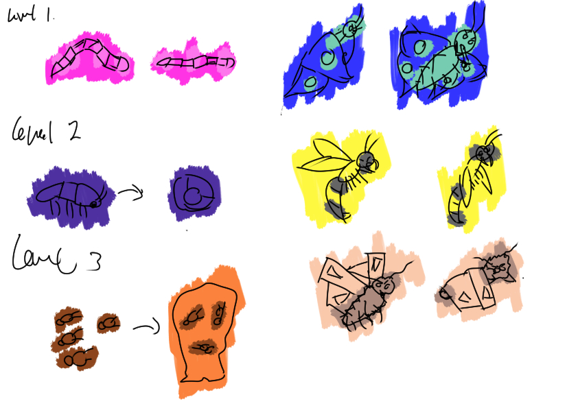Level 2 will have a slope with beetles rolling through and wasps who move faster than the butterflies. I may switch levels two and three depending on how the player moves on this level.