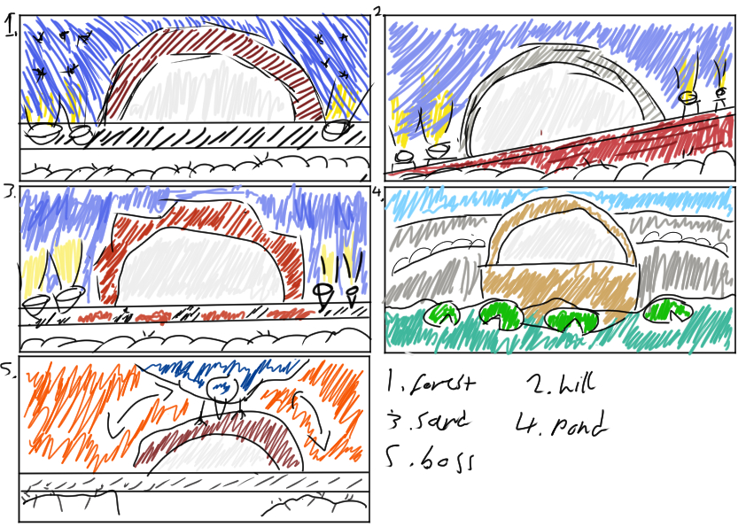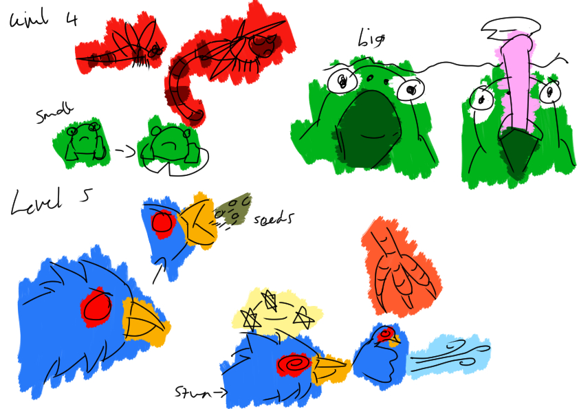 level 1 will be a basic flat stage where worms will squirm in slowly from the sides while butterflies float in from the sky. This level will teach the basics of the game.